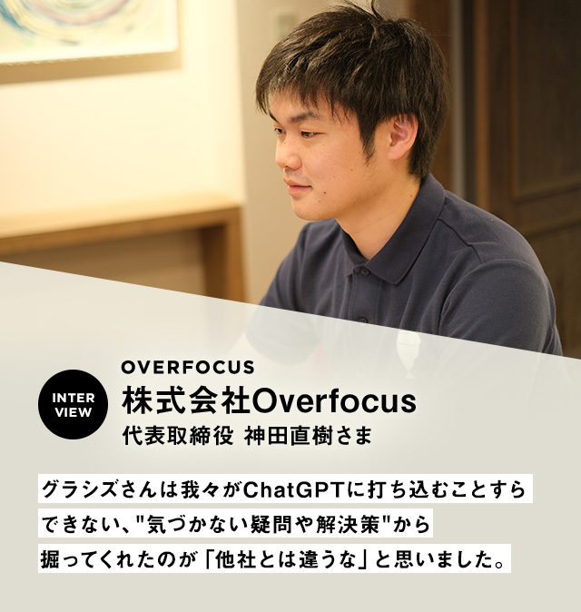 でもグラシズさんは、我々がChatGPTに打ち込むことすらできない、”気づかない疑問”や”気づかない解決策”とかから掘ってくれたのが「他社とは違うな」と思いました。